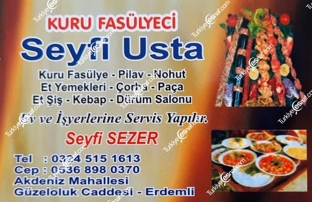 Erdemli kuru fasulye, Erdemli kuru fasulyecim Seyfi usta, Erdemli pilav, Erdemli çorba, Erdemli paça, Erdemli et şiş, Erdemli kebap, Erdemli Dürüm, Erdemli kuru fasulyeci, Erdemli kebapçı, Erdemli çorbacı, Erdemli pilav üstü kuru, Erdemli ev tadında kuru pilav, Erdemli lokanta, www.erdemliesnaf.com, www.mersinesnaf.com, www.akdenizesnaf.com, www.turkiyeesnaf.com